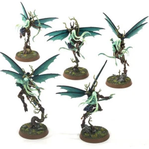 Espèce d’esprits sylvains qui n’ont émergé que très récemment au sein des Sylvaneths, les Archers Diaphanes sont doués du vol grâce aux zéphrites qui s’accrochent à leur torse. Avec une vitesse et une mobilité invraisemblables, ils s’envolent là où on a besoin d’eux sur le champ de bataille, fondant pour tirer sur l’ennemi et esquivant les contre-attaques grâce à la diversion offerte par leurs nuées d’insectes. Une fin effroyable guette celui qui tombe sous les traits de ces tireurs d’élite, car la pointe de leurs flèches contient des larves voraces qui dévorent leur cible de l’intérieur.