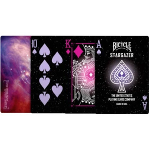 Le jeu de cartes Stargazer 201, la dernière édition de notre collection Stargazer, est inspiré des constellations, les couleurs rappelant les profondeurs de notre galaxie. Le design, les couleurs et les symboles sont inspirés des nuages tourbillonnants qui entourent un trou noir.
