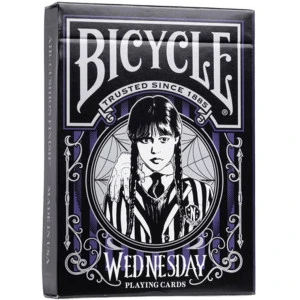 Plongez dans le monde sombre de la Nevermore Academy avec les cartes à jouer Bicycle Wednesday ! Inspirées par la célèbre série Netflix mettant en scène Jenna Ortega dans le rôle de Mercredi Addams, votre prochaine partie de cartes vous entraînera dans une danse macabre palpitante, tandis que vous mélangez des cartes noires ornées de personnages favoris de la série.