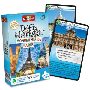 Chaque carte Défis Nature – Monuments de Paris est illustrée d’une photographie du monument, de ses caractéristiques (« prouesse architecturale », « date de construction », « visiteurs par an », « hauteur ») et contient du contenu éducatif pour en savoir plus sur les monuments de Paris. Parfait pour apprendre en s’amusant !
