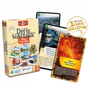 Chaque carte Défis Nature – Pays du monde est illustrée d’une photographie d’un lieu symbolique du pays, de ses caractéristiques (« le nombre d’habitants », « la superficie », « l’espérance de vie » « l’indice de bonheur ») et contient du contenu éducatif pour en savoir plus sur les différents pays du monde. Parfait pour apprendre en s’amusant !