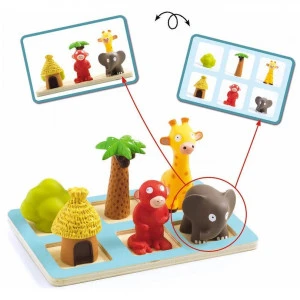 Pour reproduire la photo, l’enfant doit placer correctement les figurines sur le plateau. Où est la girafe, devant ou derrière l’éléphant ?