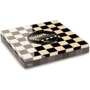 Un échiquier moderne de 35 x 35 x 5 cm avec des pièces d’échecs résolument design, qui se rangent facilement dans le tiroir du plateau de jeu.
