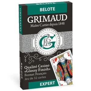 Jeux de 32 cartes avec un graphisme soigné tradition Grimaud, un toucher lisse, une glisse optimale, une opacité parfaite, des coins arrondis et des doubles figures. Portraits et format français spécialement conçus pour jouer à la belote dans le respect des traditions.