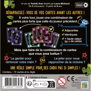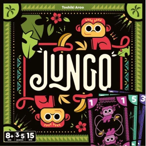 Jungo est un jeu de construction de main où le but est d’être le premier à se débarrasser de toutes ses cartes. À chaque tour, vous devez battre la combinaison sur la table en jouant des cartes adjacentes de même valeur de votre main… sans jamais les trier ! Plus vous jouez de cartes, plus la combinaison est forte. Si vous ne pouvez pas jouer, vous piochez une carte et décidez de la garder ou de l’exposer à tous. Le premier joueur à se défausser de toutes ses cartes remporte la partie.