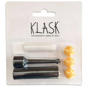 Un set de pièces de rechange pour Klask : 3 balles de jeu – 5 aimants blancs – 1 aimant guide – 1 pion magnétique.