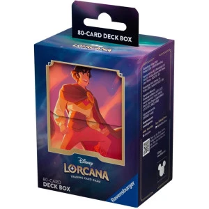 Cette deck Box à l’effigie de Aladdin pour le jeu de cartes Lorcana peut contenir 80 cartes protégées au format 63×88.