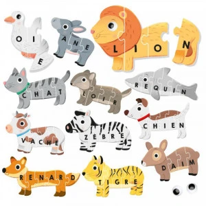 Assemble les puzzles à encastrements auto-correctifs des animaux et écris tes premiers mots ! Tu peux également animer les animaux grâce aux yeux autocollants mobiles.