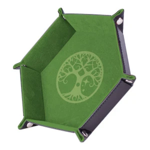 Piste de dés Yggdrasil Vert en simili-cuir et velours, montable et démontable avec boutons-pression métal. Base antidérapante et piste silencieuse.