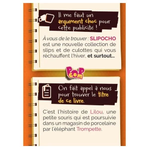 Bienvenue chez Pop Com ! Vous venez d’être embauché·es par la crème des agences publicitaires et il va falloir bosser les loulous ! Tour à tour vous allez rédiger des slogans, dessiner des logos, prendre la pose, jouer la comédie, faire la voix off d’une publicité… Vous n’allez pas vous ennuyer ! Alors à vous de jouer, sublimez les campagnes de pub, et apportez vos idées innovantes.