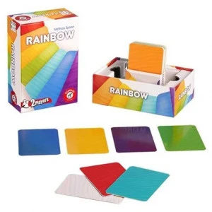 Dans le jeu de memory coloré « Rainbow », les joueurs essaient de poser le plus d’arcs-en-ciel possible dans une rangée commune de cartes. Pour cela, 57 cartes colorées sont disponibles. Le recto et le verso ont chacun une couleur différente. Et c’est justement ce qui rend le jeu si passionnant: le premier joueur ne voit toujours que le recto, alors que l’autre peut voir le verso.