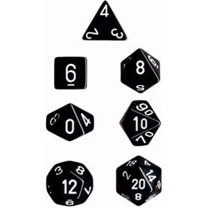1 x D4, 1 x D6, 1 x D8, 1 x D10, 1 x D10 décimal, 1 x D12, 1 x D20.