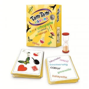Tam Tam Chrono utilise les mots irréguliers de la langue française (femme, oignon, poêle …). Il permet d’améliorer de façon ludique l’orthographe et la lecture tout en remuant les méninges !