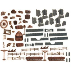 Cette boîte rassemble 106 éléments à peindre soi même, issus des différentes boîtes de la gamme Terrain Crate, pour offrir de quoi décorer votre aventure et recréer un paysage de village en ruines.