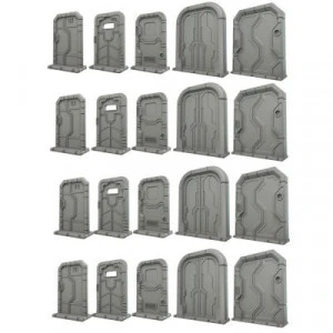 This set contains 20 pieces of pre-assembled plastic scenery, designed for 28mm sci-fi games, including 8 Double Doors and 12 Single Doors. Double Doors measure 50mm across and Single Doors measure 25mm across.