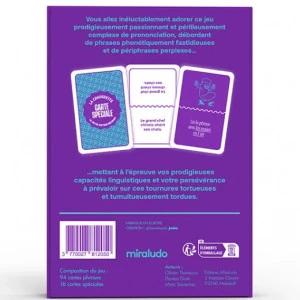Ce jeu consiste à enchaîner la lecture de phrases compliquées à prononcer (virelangue) en respectant les Twist posés par les adversaires (avec une patate chaude dans la bouche, les lèvres serrées, sans respirer, etc….)