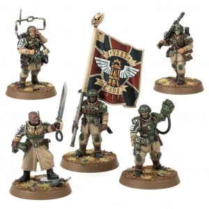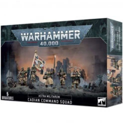 Ce kit plastique permet d’assembler une Escouade de Commandement Cadienne, composée d’un Commandeur Cadien et de quatre Gardes Impériaux Vétérans. Le Commandeur Cadien est armé, selon votre choix, d’un pistolet laser, d’un pistolet bolter ou d’un pistolet à plasma dans une main et d’une épée tronçonneuse, d’une épée énergétique ou d’un gantelet énergétique dans l’autre. Chacun des Vétérans qui l’accompagnent porte un équipement différent : un médic de terrain avec un fusil laser et un médipac ; un opérateur vox avec un pistolet laser et un vox de maître ; un garde du corps avec un pistolet laser et, au choix, une épée tronçonneuse, une épée énergétique ou un gantelet énergétique ; et un porte-étendard avec un fusil laser et un étendard régimentaire. Le garde du corps et le porte-bannière peuvent à la place être assemblés avec une arme spéciale : un lance-flammes, un lance-grenades, un fuseur ou un fusil à plasma.