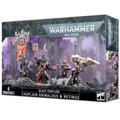 Armé d’un pistolet à plasma et d’un crozius d’artificier, Grimaldus va au combat pour châtier les psykers ennemis. Il est accompagné d’une procession de servitors qui incitent les Black Templars à accomplir des hauts faits d’héroïsme et de dévotion pour gagner la faveur de l’Empereur.