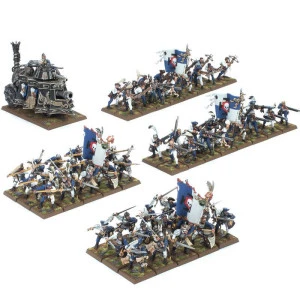Cette boîte vous fournit le noyau d’une puissante armée de l’Empire de l’Homme pour Warhammer: The Old World. C’est un bon moyen d’entamer une nouvelle force ou d’en étoffer une existante. Les Troupes Régulières de cette boîte peuvent être équipées de diverses options d’armes incluant des hallebardes et des lances, et peuvent aussi faire office de Vétérans des Troupes Régulières. Les Troupes de Tir de l’Empire peuvent être assemblées comme une seule unité de 30, armée d’arquebuses ou d’arbalètes, ou de 15 de chaque. Le kit inclut aussi les éléments supplémentaires pour distinguer des membres de ces unités comme des champions, des porte-étendards et des musiciens. Ces braves soldats polyvalents sont rejoints au combat par un Tank à Vapeur, disposant de multiples options cosmétiques afin que vous puissiez personnaliser votre machine de guerre redoutable.